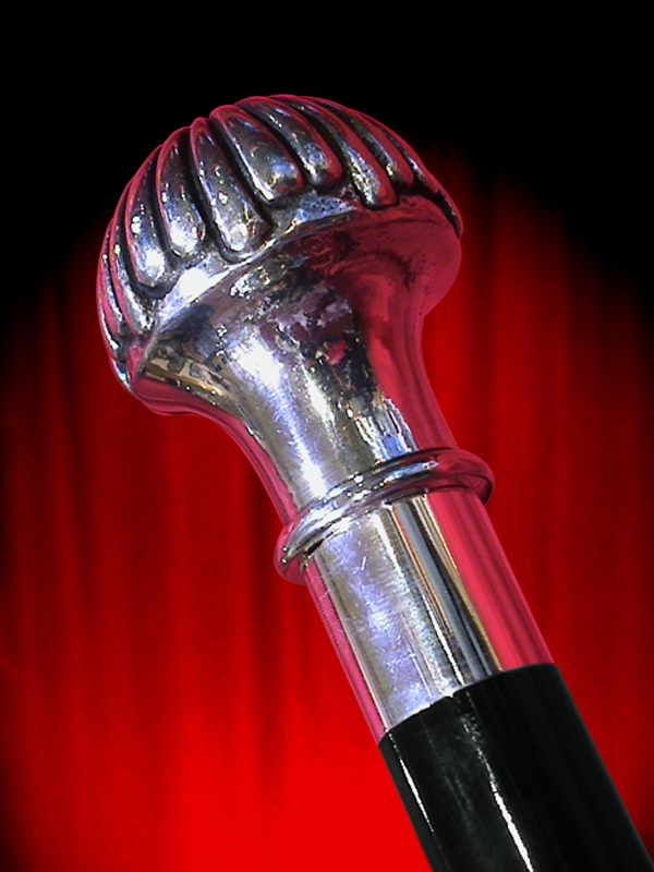 Canne de marche et élégance en bois noir à pommeau en étain massif ciselé.